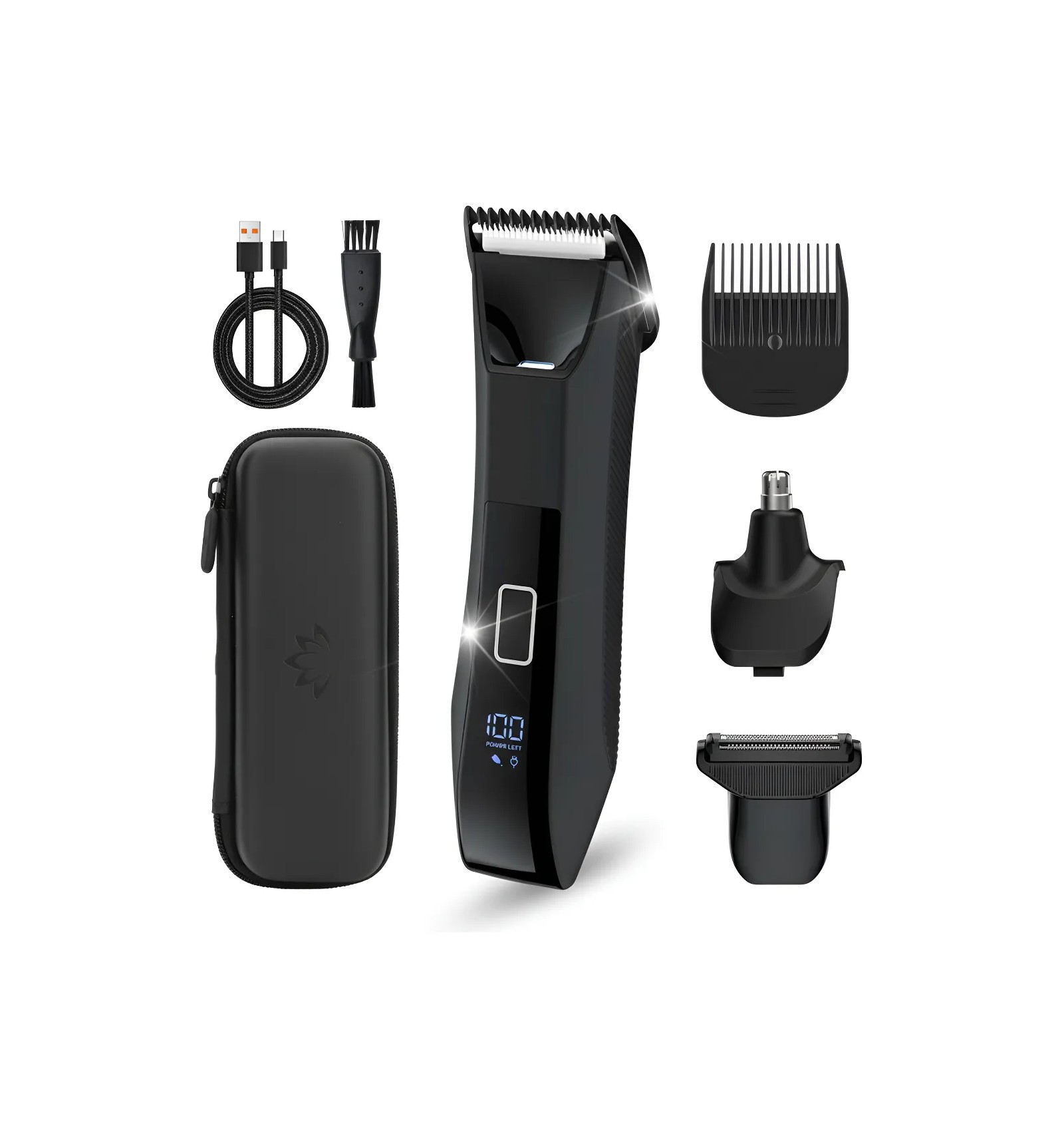 Incluye: Afeitadora principal, 3 cabezales intercambiables (recorte, vello corporal, nasal), peine guía, cable USB, estuche de viaje EVA.